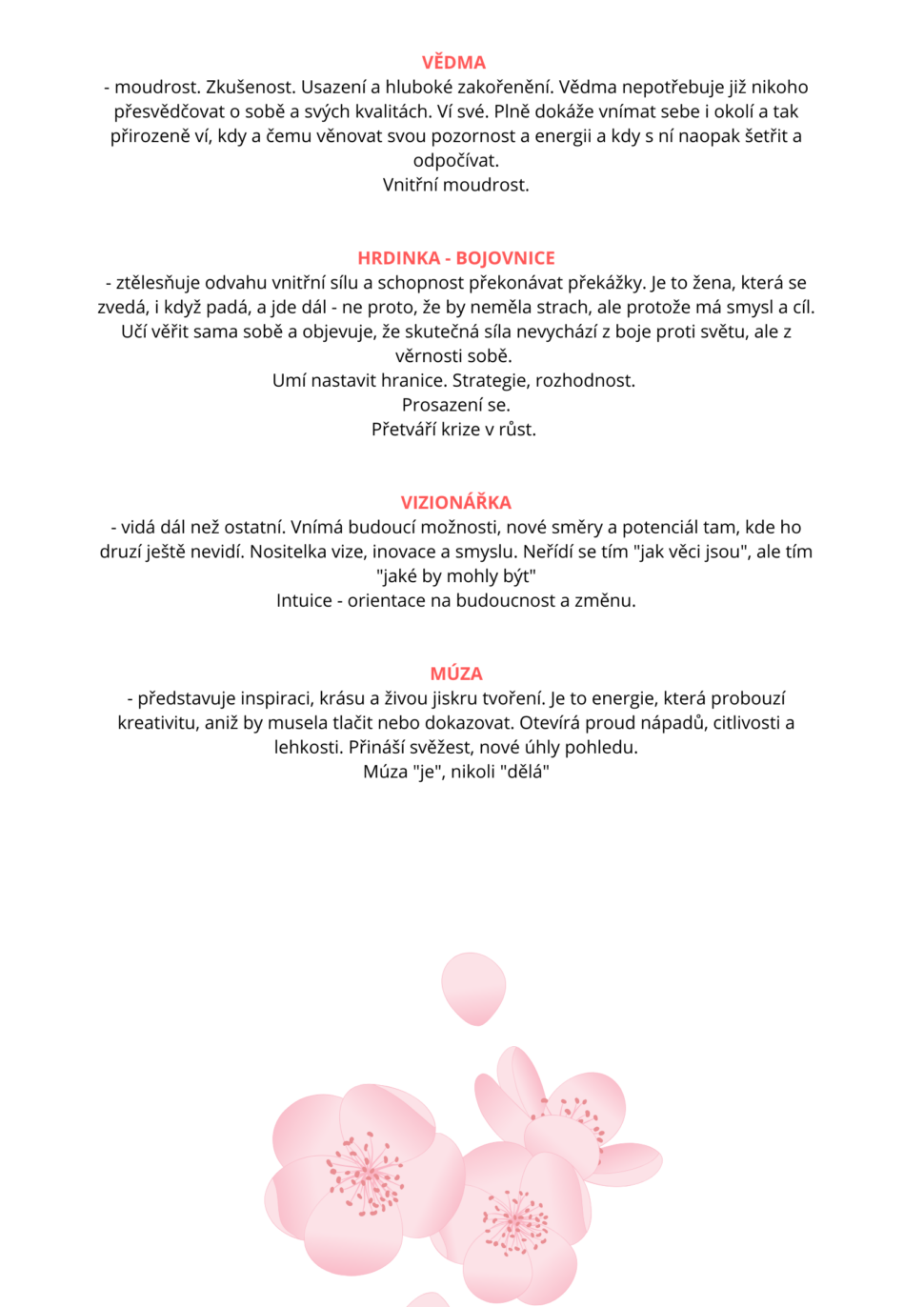 "Vědomá práce s těmito archetypy je pro mne vždy krásné zastavení a připomenutí toho, že jsem žena...kde zbytečně hrotím, kde jsem se "zasekla" anebo kde si mohu naopak dát pohov. Připomenutí toho, že v jemnosti je síla, toho kdo skutečně jsem, co umím, mé hodnoty i to množství lásky a moudrosti uvnitř mě."